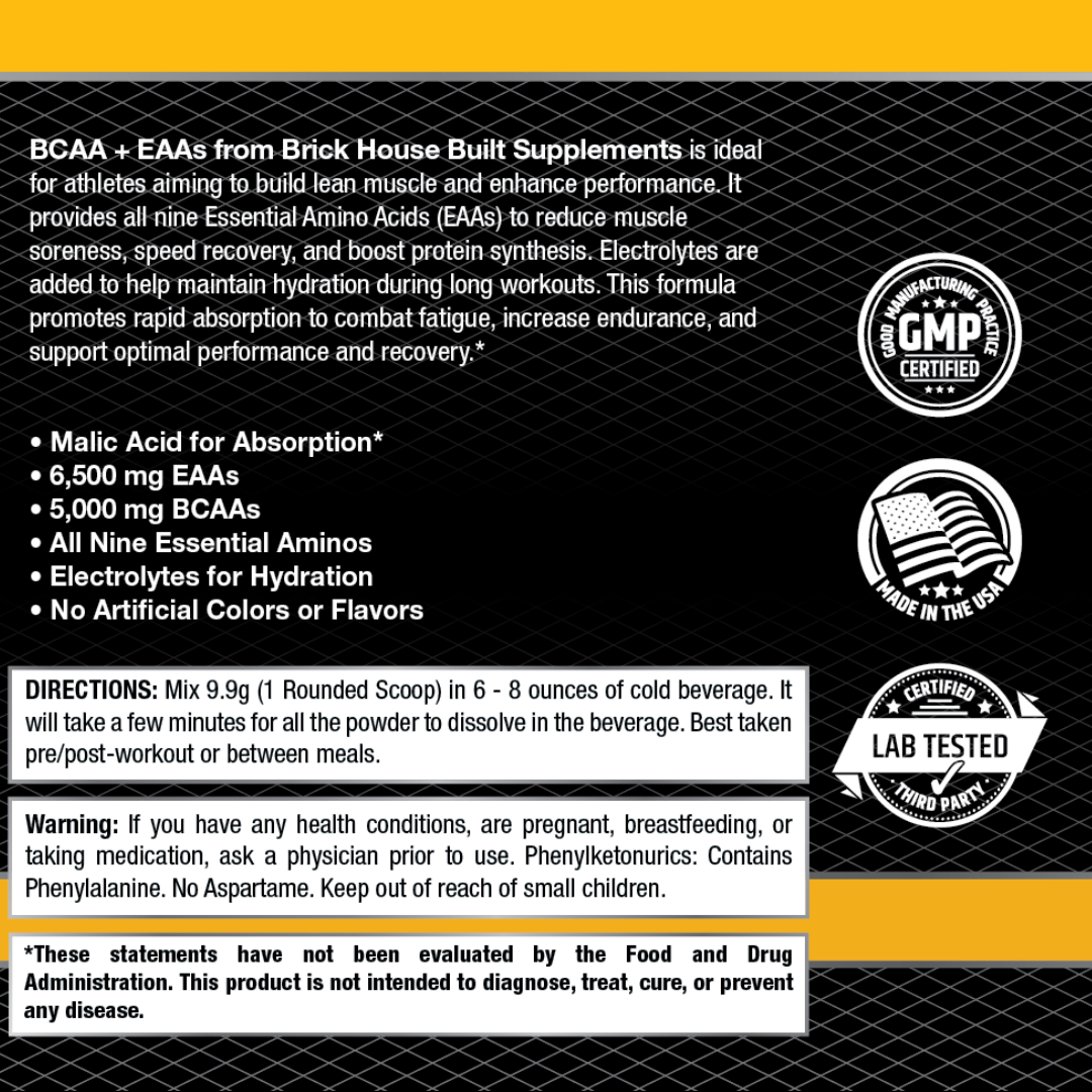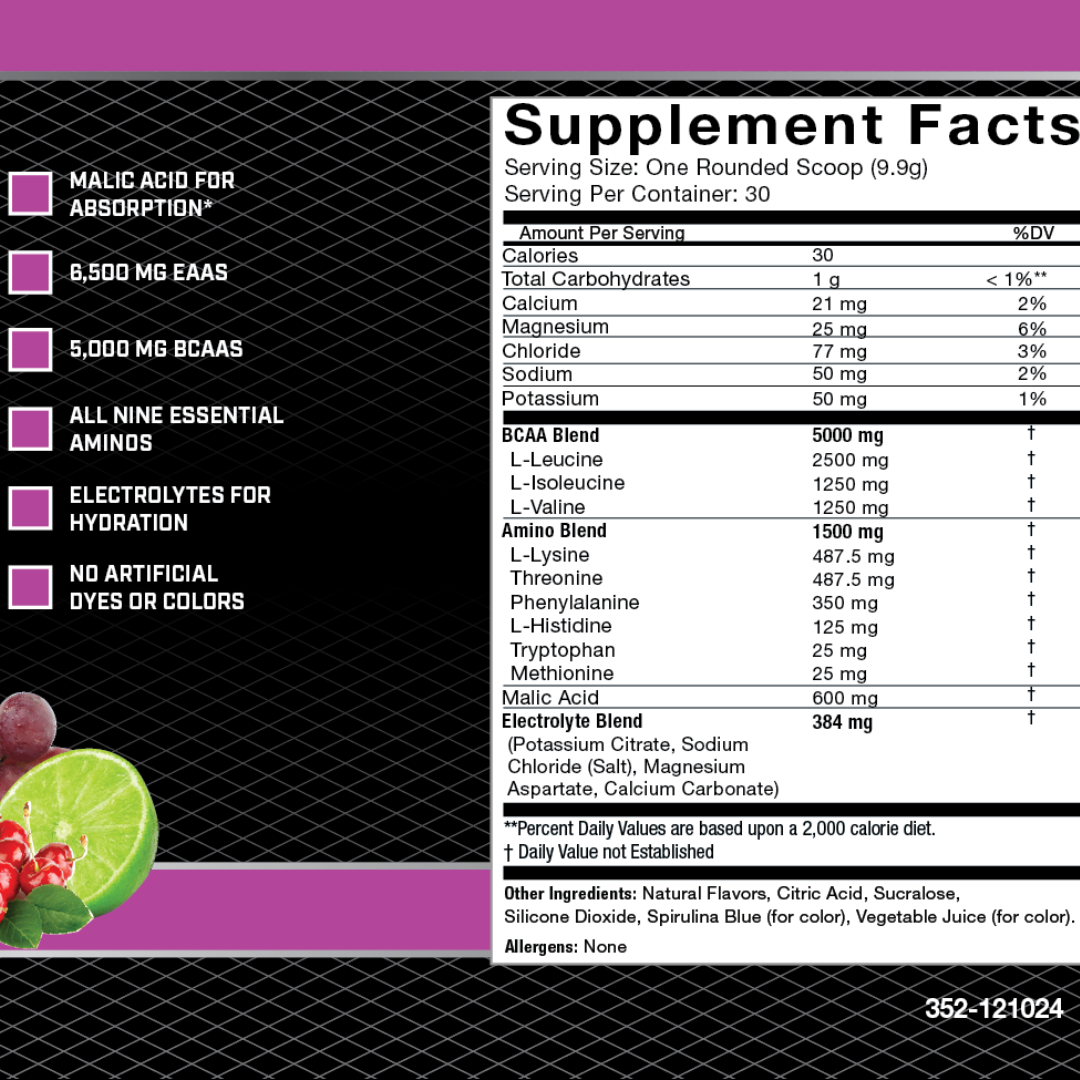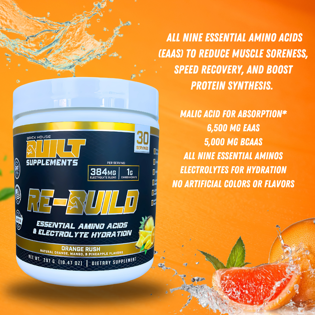 Re-Build BCAAS+ EAAS contains ZERO Artificial Colors or Flavors and is ideal for athletes aiming to build lean muscle and enhance performance. It provides all nine Essential Amino Acids (EAAs) to reduce muscle soreness, speed recovery, and boost protein synthesis. Electrolytes are added to help maintain hydration during long workouts. This formula promotes rapid absorption to combat fatigue, increase endurance, and support optimal performance and recovery.*